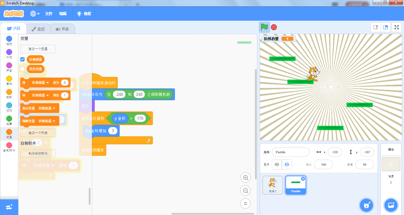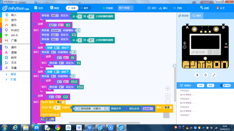 3月20日的时候我发过一篇文章使用scratch图形化编程,小学生就可以制作“是男人就下100层”的文章,教大家如何在scratch3.0中制作一个这样的小游戏,今天我们把这个游戏搬到“掌控板”上来,我们一起来制作一下吧!